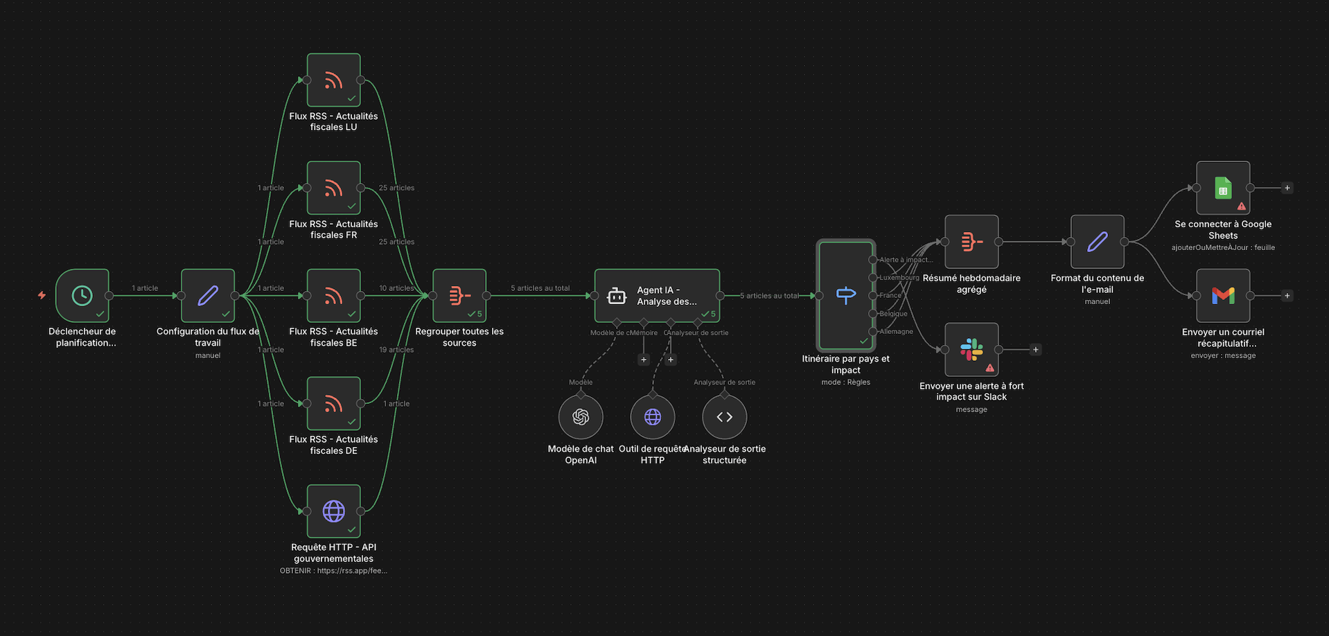 Assistant de veille réglementaire, surveillance automatique des changements fiscaux (LU, FR, BE, DE) Synthèse hebdomadaire des actualités patrimoine alertes sur mesures impactant les clients